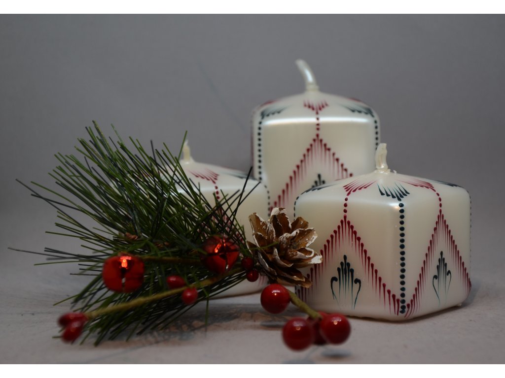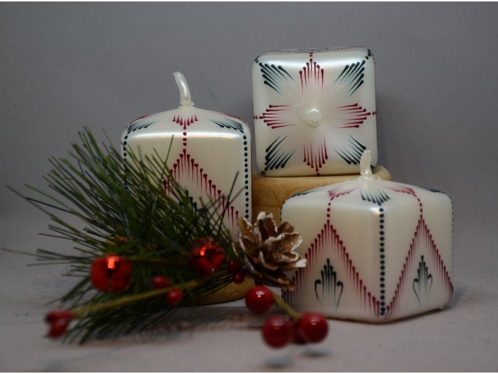 Bílá perleťová svíčka malovaná červeným a zeleným voskem.