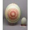 Opravdu velká kraslice z pštrosího vejce (cca 13 × 16 cm), ručně malovaná několika barvami vosků. Díky své velikosti a bohatému zdobení působí nepřehlédnutelně a luxusně – každý detail vynikne naplno.