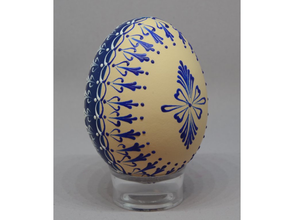 Kontrastní kombinace bílé a modré/červené na kraslici z půlky malované barevně a z půlky s ponechaným přírodním odstínem.